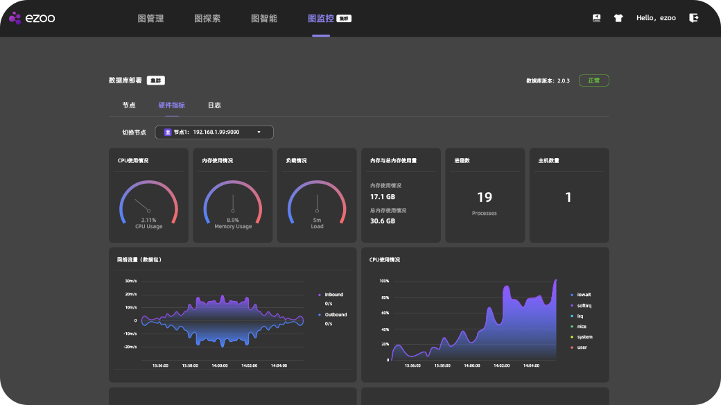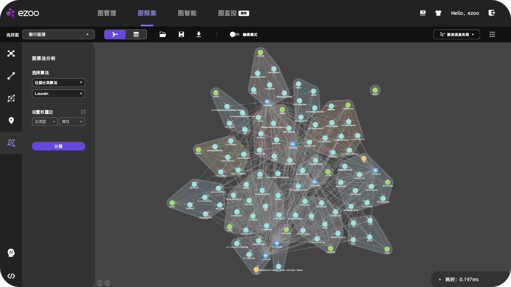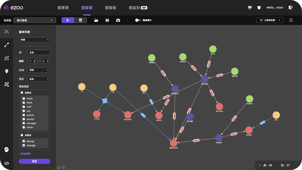 作为eZoo图平台的底座,eZoo GDB是全自主研发的原生超高性能图数据库,基于c++,通过数据压缩、内存治理、无锁并发等多种核心技术实现的内核,为上层应用提供了数据导入、图管理、图查询等基础能力,内置数十种图算法,并与eZoo GNN深度整合。